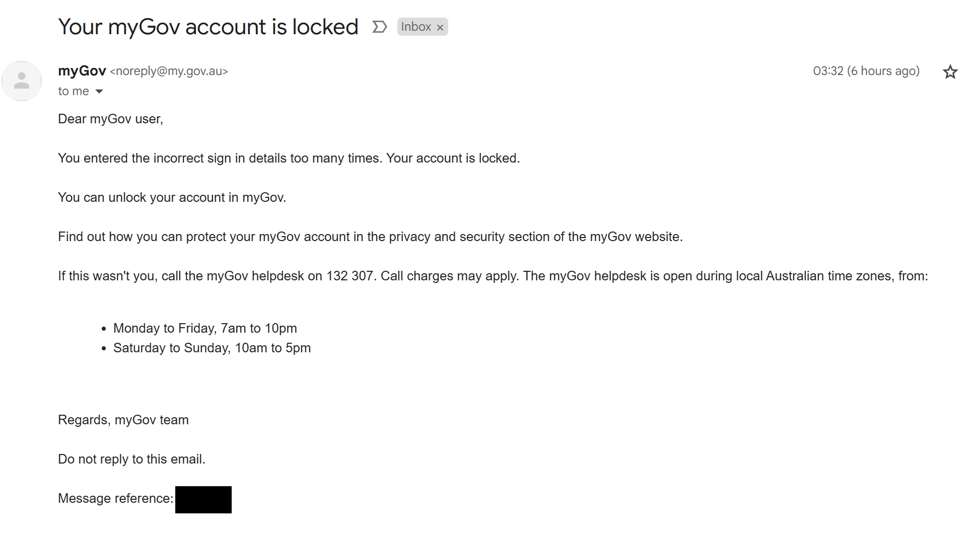 Hi, it's Tori here. Overnight someone tried to hack my MyGov account. I received an email telling me I was locked out of my account.