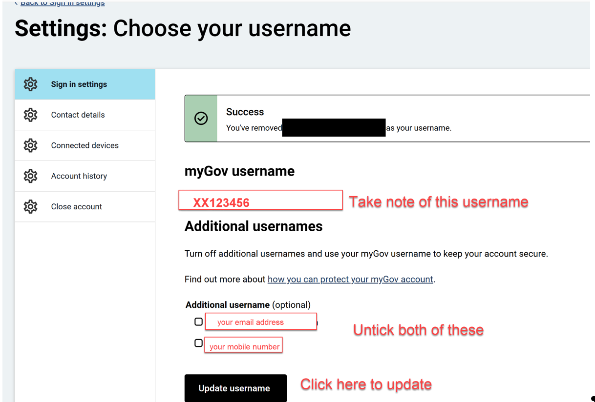 Account”, then “Account Settings”, then “Sign in Settings". Here, I should note down the MyGov username that has been generated by MyGov and